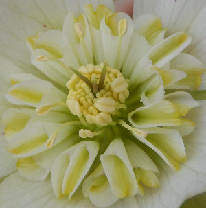 まずは「DDホワイト×セミイエロー」. 結果はSDホワイト.親からすれば順当か.ホワイト剣弁でネクタリーが何とも個性的.筒状になっていてフリフリ.しかもイエローの太い筋が入っている.こんなの見た事無い.