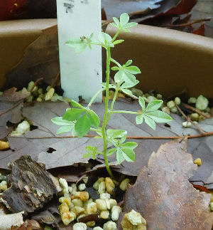 もう1つの鉢は大阪で越冬,2つのイモがありグングン茎が伸びて期待していたのにすっかり枯れてしまいガッカリ.この際イモを掘って地植えにしておこうかと考え,鉢を掘ってみたら…おぉ!?芽が出てる!う~みゅ,休眠していたのでは無かったのか!?この気候ならまだ活動範囲なのか?ビックリして写真だけ撮って,やや深めのところにイモを埋め込んでおいた.地上部に芽が出る日は来るのだろうか?