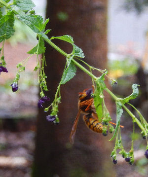 この小さな花に大きな図体のスズメバチがやってきた.雨上がりに撮った写真なので水滴でも舐めていたんだろうか.このところ庭に出るとブーンというスズメバチの羽音をよく聞く.いよいよスズメバチのシーズン.またトラップを作らないといけないかな?