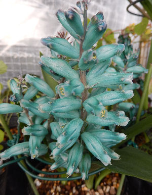 園芸植物の中では、ヒスイカズラとイキシアのヴィリディフローラくらいしか似た色に咲くものがないような気がします。少なくともヒスイの色ではないですね。
