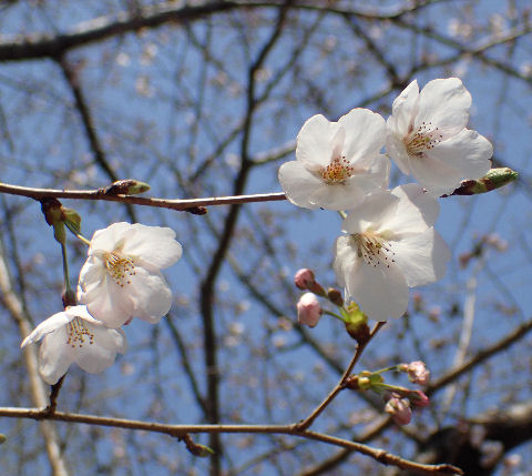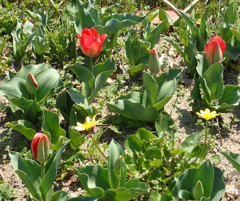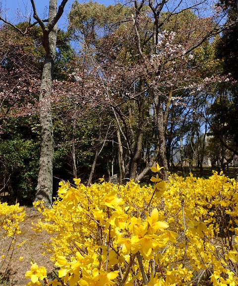 桜は順調に咲き進み,レンギョウが満開.遊歩道の脇に作られた花壇ではチューが咲き始めた.黄色の花は何だろう?