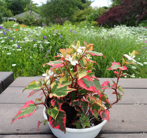 ミヨシペレニアルガーデンでガーデン・テーブルの上に置かれていた錦ドクダミ.ちょうど開花中.