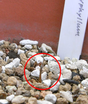 ふと見ると新芽が出ていた.初夏に地上部が虫害を受け危ない状態だったので,地際でカットしたものだが,復活の兆し.でもねぇ,この季節にこんなにチビでは,とても花は拝めそうにない.