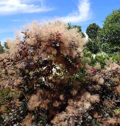 スモークツリーの花が終わり煙っている.秋の空が似合うガーデン.