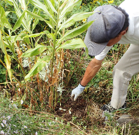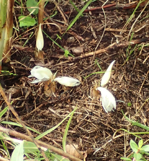 小黒さんが他の植物をどけてくれたから見えたけど,普通は覆い被さった植物に隠れて見えないだろうなぁ.(~_~;) 地面から顔を出すミョウガの花は初めて見た.食べられるそうだけど,もったいなくて食べられない.(^^;