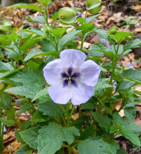南アメリカ原産のナス科植物.昔海外通販でNicandraの種がオマケに付いてきたことがある.花の中心は白っぽかったと思うので個体差があるのか,違う種類だったのか.ずいぶん昔なので真相は不明.