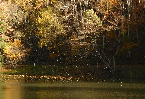 池のほとりを歩いているとビュービュー凄い風.それにつられて木々の黄色く色づいた葉がいっせいに舞い上がり,日に照らされてキラキラ輝きながら水面に舞い降りていった.雨が降るように落ち葉がゆっくり降っている.幻想的な光景にしばし見とれ,池のほとりに佇んでいた.雨上がりの晴れ間だっただけに空気が澄んでいてキレイ.(*^^*)