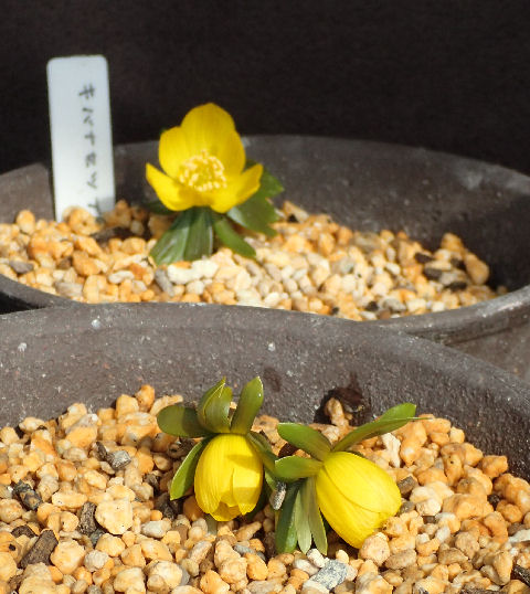 画像左で,奥の鉢は先に開花したキバナセツブンソウ.手前の別鉢に植えたキバナセツブンソウも開花スタート.