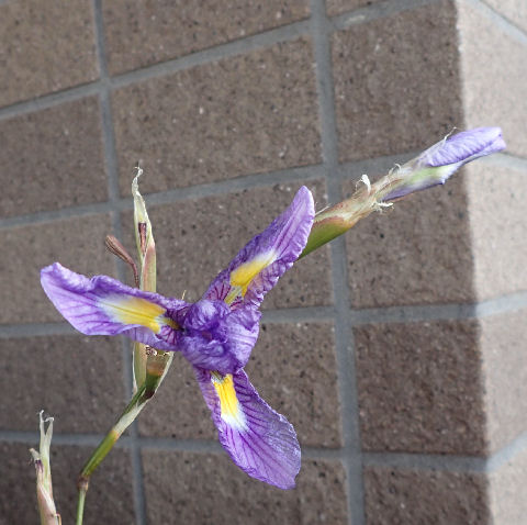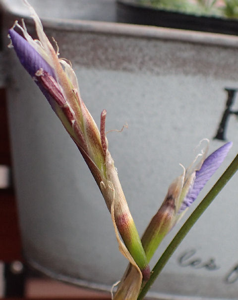 花がいったん終わったと思っていたらすぐ復活,次の花が咲き,さらに次へ.これは上から2番目の花が咲いているところ.相変わらず花弁が丸まって咲いている.最低マイナス5度くらいまで下がったこの冬,南ベランダで過ごし次々開花するのはスゴイ.5号スリット鉢に1株植え.