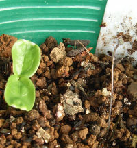 画像はレピドムのイモの発芽した茎だが,横に立派な双葉がある.いったい何の双葉だろう?テカリがあって立派な双葉ゆえ,抜くのも惜しくてしばらく栽培してみることにした.発芽したイモを別鉢へ移植し,このポットには双葉を残し,ついでに肥料(マグアンプK)をパラパラとまいておいた.VIP待遇で後日もし雑草だと分かったら…思いっきり笑おう.(^◇^)