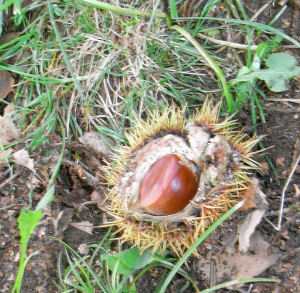 そろそろクリが落ち始めているようだ.気をつけてクリの木の下を見ると…ある,ある.イガに入ったままのヤツは靴でイガを割り,中身を取り出す.青いイガのものはなかなかパカッと割れてくれず苦戦する.苦労して取り出した実も虫食いのものがあったらハズレ.木によって虫食いの多い木とそうでない木があるみたい.