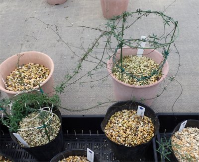 で,目にするのは画像のような光景.近くの鉢に茎を伸ばし,茎同士が絡まったり相手の支柱に絡みついたり.(~_~;)