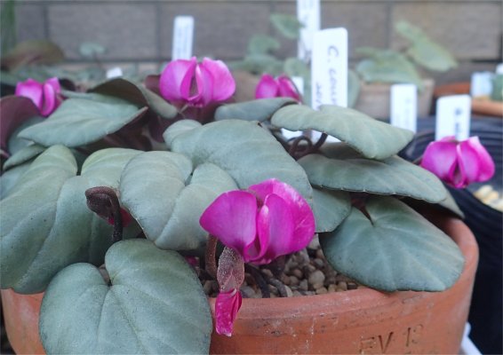 左は先に開花が始まった原種シクラメン・コウム.昨年11月に原村実践農業大学校・鉢花温室で購入した株.