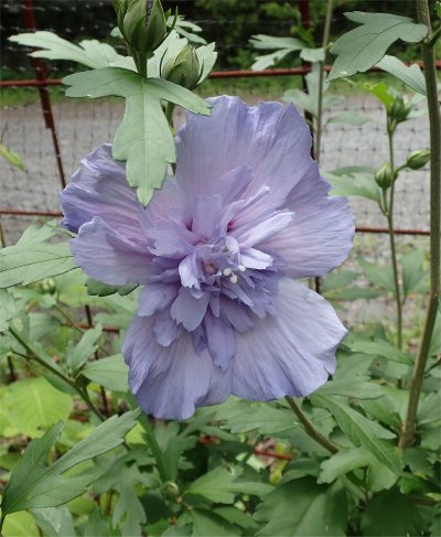 後ろに鹿避け柵がある.柵の高さは1.8mほど.矮性ムクゲだとこれくらいの高さで止まるのかな?今はまだ半分にも至っていない.柵が見えないほどに早く育って欲しい.