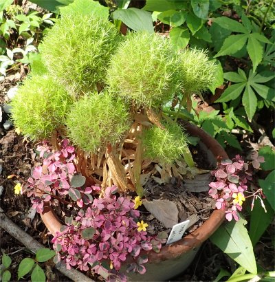 鉢植えの緑のボールみたいなものはダイアンサス・てまり姫.(Dianthus burbatus)とてもナデシコ仲間には見えないお姿で面白いからゲット.(^^; 暑さで枯れるかと思いきやそのままの姿を保っている.いつまで保つのやら?