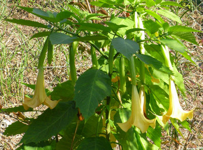 線路脇で見かけた地植えのエンジェルス・トランペット.