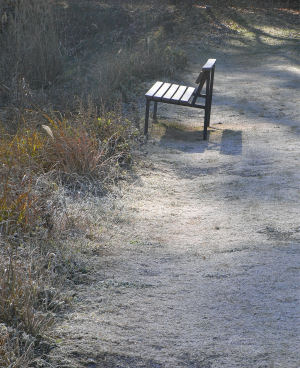 画像は竜神池を一周する歩道.すっかり霜が下りて真っ白になっている.日が当たる所では既に霜も溶けていたが,日陰はご覧の状態.ベンチも白く光っていた.この冬は寒さが厳しいのだろうか…なんて思いながら歩いていたのだった.