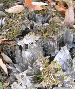 画像は霜柱が地表の土を持ち上げている様子.氷の長さは10センチほど.