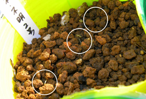 さて,今年春に不明2号から採種したタネを11/11に20粒ほどまいた.ずっと北バルコニーに置いていたが本日南ベランダに移動.その際,4粒が発芽または発根しているのを確認.(画像には3個しか見えてないけど)