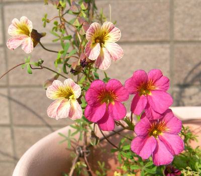 北バルコニーで冬を過ごした青花ナスタの寄せ植え鉢.親株(種を付けた株)は青花ナスタ73号.以前レポートした雑種アズレウムもこの中の花.