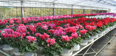 原村・実践農業大学のハウス内で.ズラリと並べられたシクラメン.