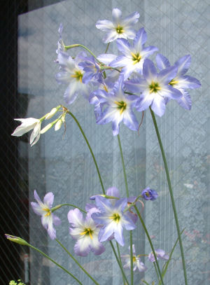 涼しげな白とブルーがとってもきれい.でもよく見ると…1株だけ真っ白の花がある.あらら,白の球根が混じっている模様.(~_~;) 色もそうだけど,高さもまちまちでちょっと気になる.それもこれも皆,球根の個性って事かな.