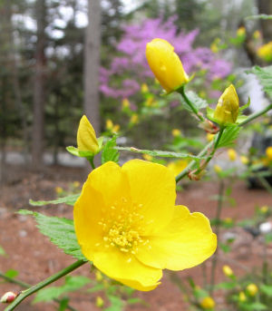 で,このヤマブキ,油断していたらニョキニョキとんでもないトコから茎を出してきます.切っても切っても出てくるので丈夫なんでしょう.鉢栽培ならそれなりの大きさでとどまるんじゃない?春らしくて良いですよ.(^^)