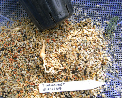 きっとこれがT.polyphyllumかな,と思っている.これも花を見たことがない.夏咲きトロパは日本の高温多湿環境では開花が難しい.と思って,蓼科に連れてきたのだが,,,以前も梅雨時に干からびてしまった.今回は「花ごころ」ブランドの山野草の土で様子を見ることに.