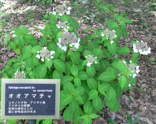 オオアマチャは普通のアマチャに比べて大株になるようだが,これはまだそんなに大きくなかった.樹高60~70センチくらい.「葉を乾燥させると甘みがある」そうだが,体験してみたくても植物園にある葉を採る訳にもいかず….(^^;