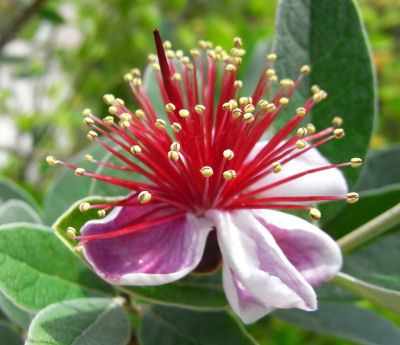 適当にまわっているとフェイジョアを発見.ウチにも何年か前からフェイジョアが居る(タネからのもの)が大きさが段違いに違う.冬場保護が必要とのことでウチでは5号鉢だもんね.(^^; これでは花はのぞめないか.