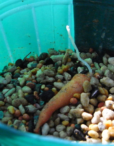 おぉっ~と,イモが発芽している!発根もしていたが,根はちぎれてしまった.(T_T) ところでこの子は誰だろう…??
