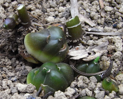 茎のカット跡が見える.横から出ているのはまさに小さなユリ根…食べられるんだろうか.(^^; よ~く見ると発芽しているのもある.地下に埋もれていると白っぽいんだけど,地上に出たら芽だけでなく根も緑色になるのかぁと感心.(^^;