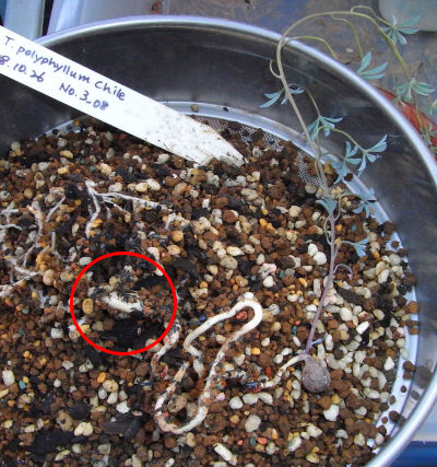 画像赤丸印のところ,根が太くなってイモになりかけている.よく見るとイモの部分までは一本の太い根があり,イモの下からは細かい根が張っている.なかなか面白い.最初はグングン根を深いところまで伸ばし,ある程度まで到達したら今度はイモを作り,その後は細かい根を張って行く,そんな成長のステージが見えてくるようだ.