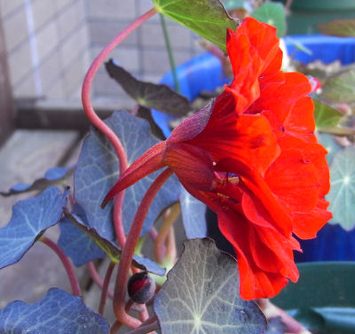 葉色は深緑,茎は赤みを帯びているところはエンプレス・オブ・インディアなどと似ているが,花色がかなり濃い赤.おまけに縮れが入っている.距有り.
