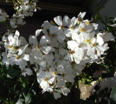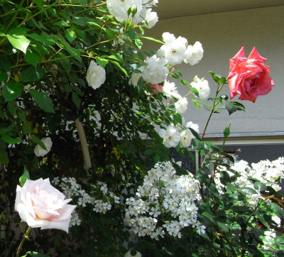 下側中央に見慣れないバラがある.小さな白バラがたばになって咲いており,右画像がそのアップ.