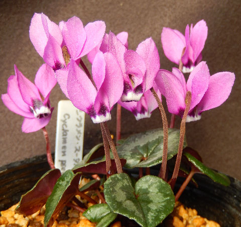 そういう目で見ると,チビ苗の方は土がキレイで新しく植え替えられたものと分かる.で,チビ苗の方の葉に注目.点々があるが病気ではない.こういう雪割草独特の模様らしい.思わず「これって病気?」と聞いてしまったが…(~_~;) 病気だったら裏を見ると白抜けするらしいが,これは裏もしっかり茶色=模様になっている.聞いて一安心.こちらは2013年の春にやはり京都で購入したもの.毎年蓼科で夏越ししていたため,蓼科と大阪を行ったり来たり.初年度は蓼科で地植えにしたが,その後ポット上げ.名前が付いていたと思うが名札はとうに行方不明.(^^;